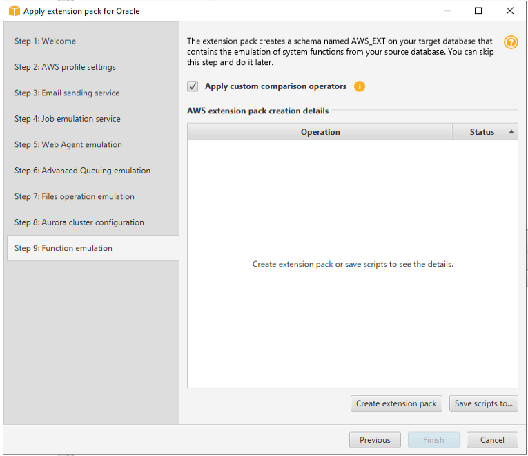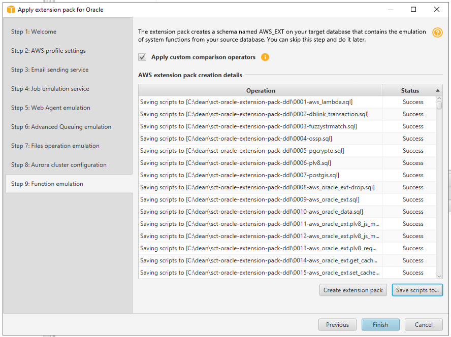 In the “Apply extension pack for Oracle” dialogue box, progress to “Step 9: Function emulation” and click on the “Save scripts to” button on the bottom right.