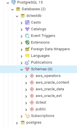 After the DDL files have been executed, the database has the aws_operators, aws_oracle_context, aws_oracle_data, and aws_oracle_ext schemas defined