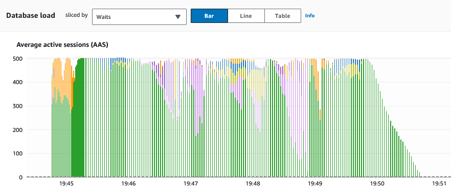 The impact of the test can be measured by Performance Insights. I ran a test with PGB_CLIENTS set to 500 users for a period of 5 minutes. The Average active sessions (AAS) displayed this spike in Performance insights as a result of the load placed on the database: