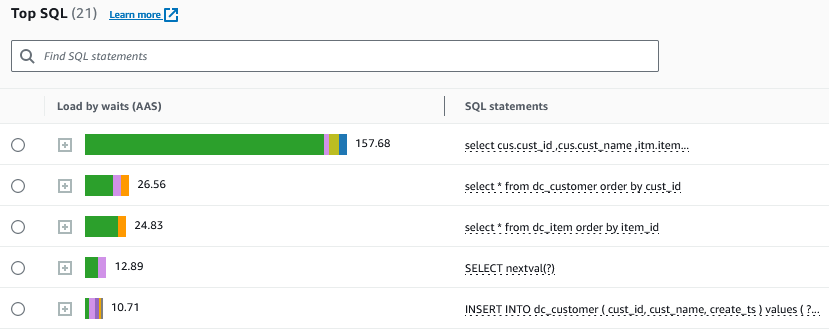 The top SQLs reported by Performance Insights also list the SQL statements that I was executing