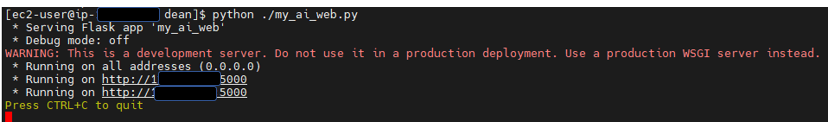 Upload the python code (see download link at bottom of page) to a file named my_ai_web.py and start the web server with the command python ./my_ai_web.py as shown in the below image.